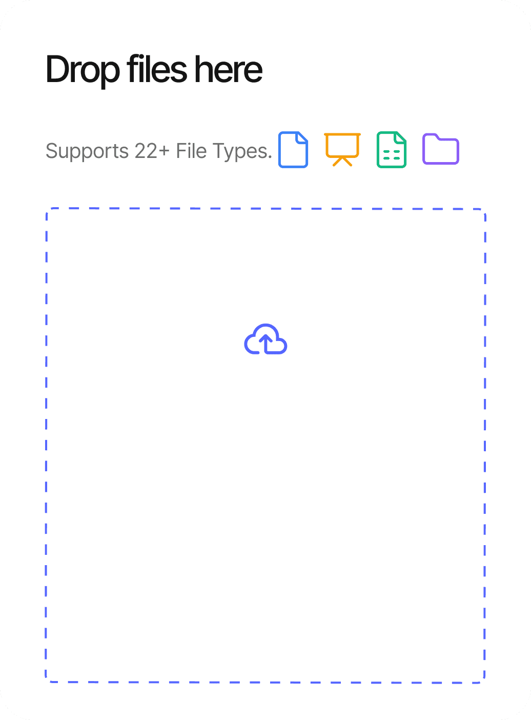 Drag and drop PDFs, Word docs, spreadsheets, presentations, or any of 22+ supported file types. Add single files or entire folders.