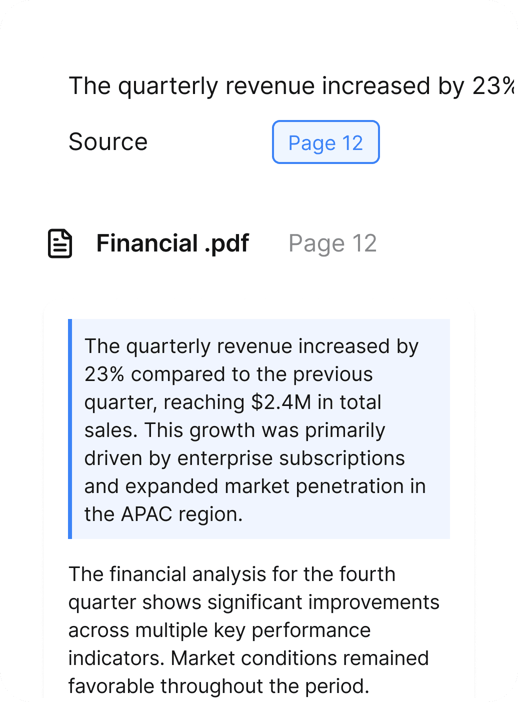 Every answer includes source citations. Click to jump to the exact page and paragraph. Trust but verify — in one click.