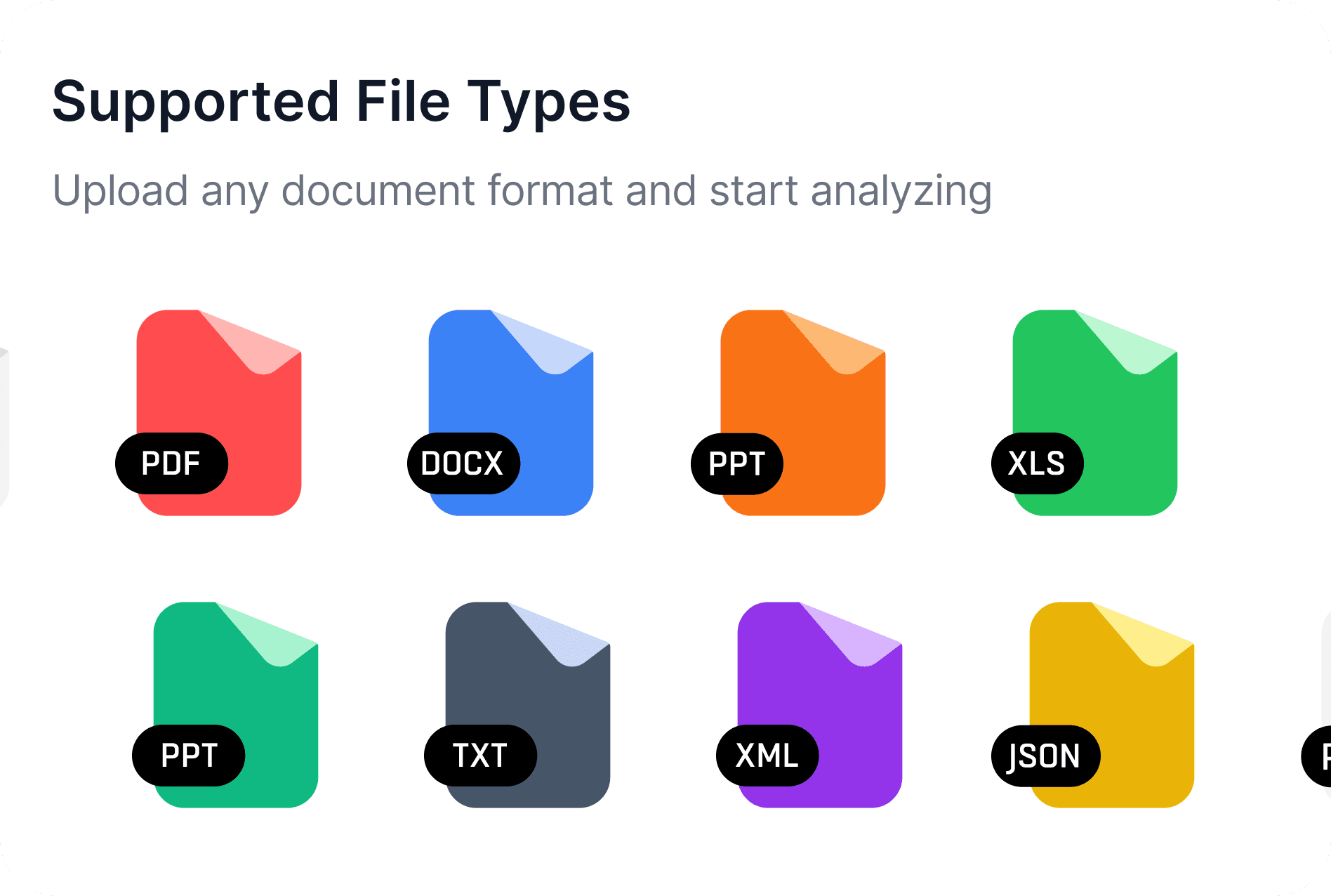 Rune supports 22+ file types including PDF, DOCX, DOC, XLSX, XLS, CSV, PPTX, PPT, TXT, Markdown, RTF, HTML, XML, JSON, YAML, ODT, ODS, ODP, EPUB, TSV, LOG, TEX, and more. We're constantly adding new formats based on user feedback.