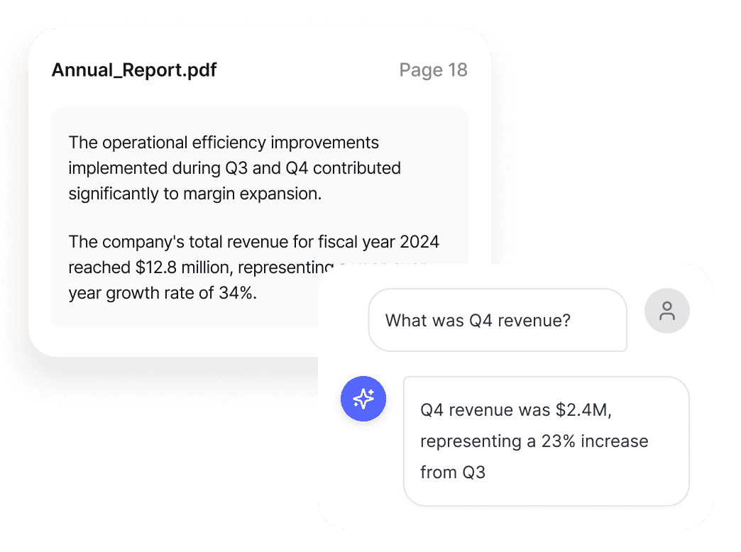 Upload PDFs, spreadsheets, Word docs, and 22+ file types. Ask questions. Get cited answers instantly.
